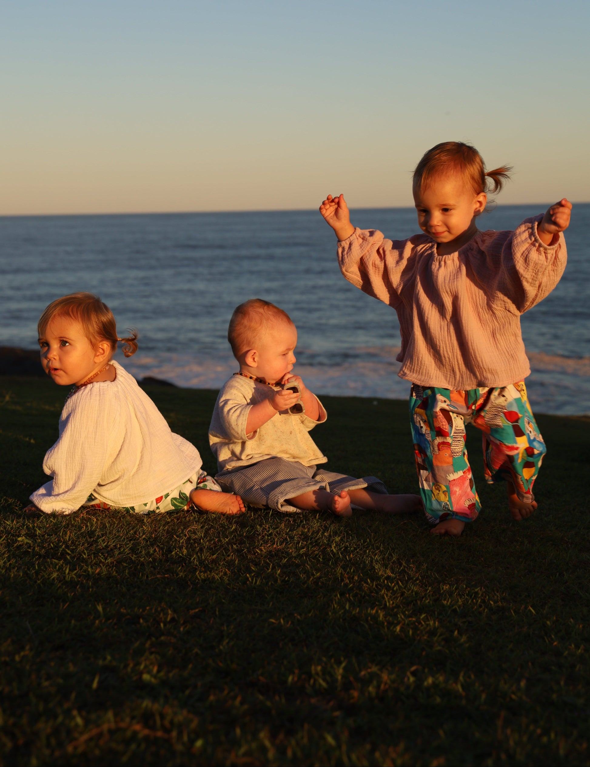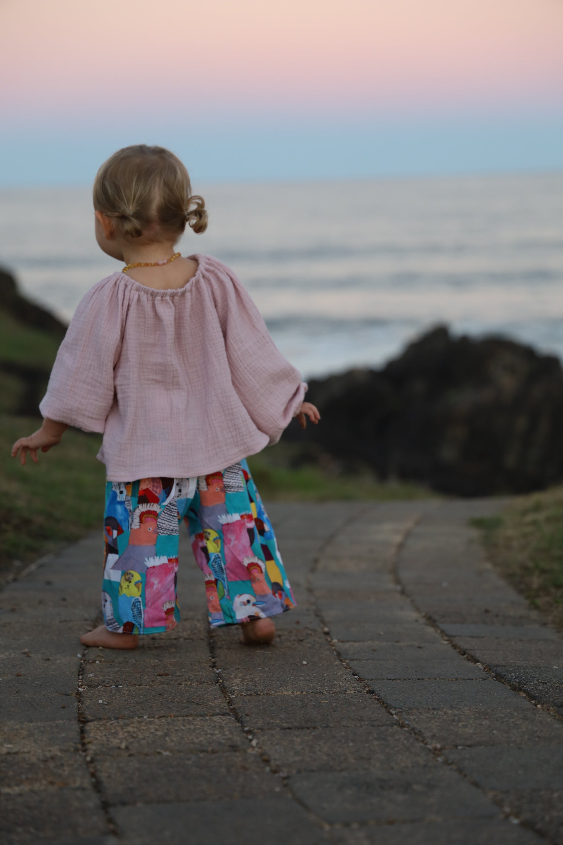 Our Charlotte Top is made from a beautiful soft cotton muslin, it is the perfect all year round material, protecting your little ones from the elements whilst still being breathable. It features an elastic neckline and cuff which allows this to be worn as an oversized fit and be grown into to give extended wear. The elastic cuffs on the sleeves can also be worn pulled up above elbows during warmer months. The charlotte top is also perfect for layering to stay warm during the colder months.
