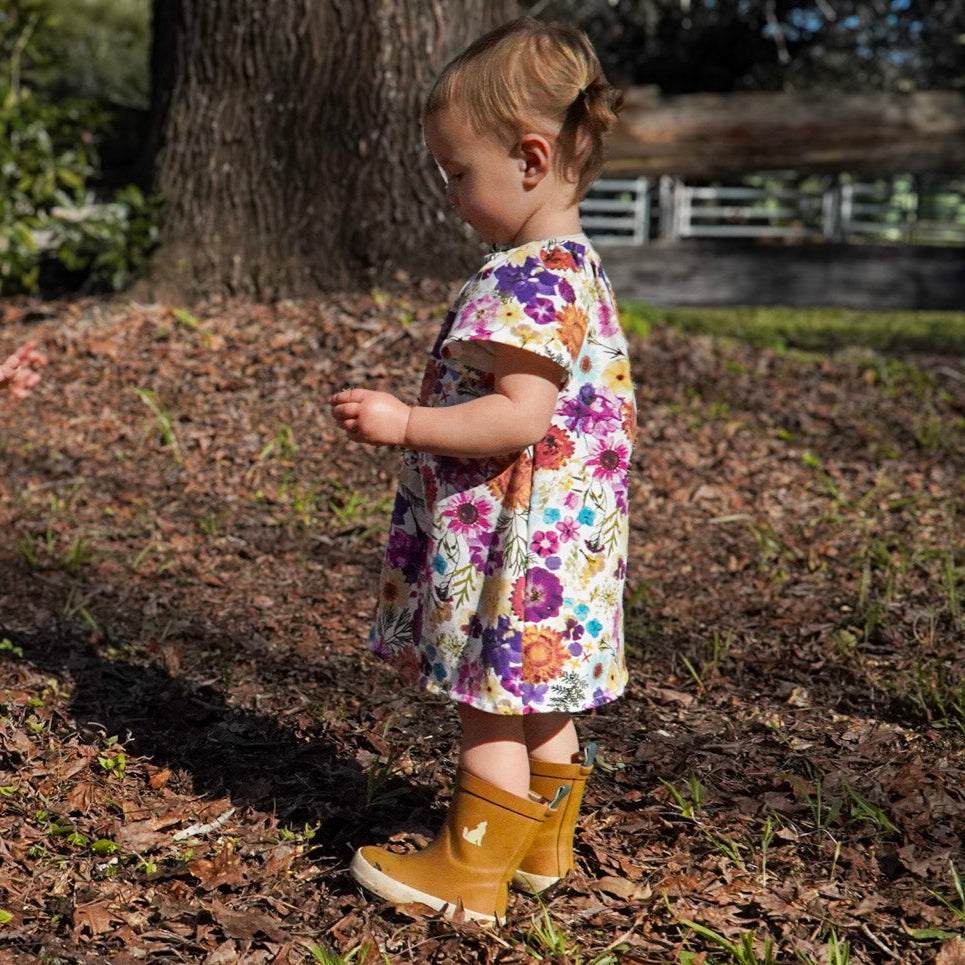 Brighten up your little one’s wardrobe with this adorable Cottage Garden Dress. Crafted from soft, breathable fabric, this charming dress features a vibrant all-over floral print —perfect for sunny days and outdoor adventures. The short sleeves and relaxed fit provide all-day comfort, while the gathered neckline adds a sweet, playful silhouette. Ideal for playdates, picnics, or special occasions, this dress is both stylish and practical. Pair with tights and it’s perfect for the cooler months.