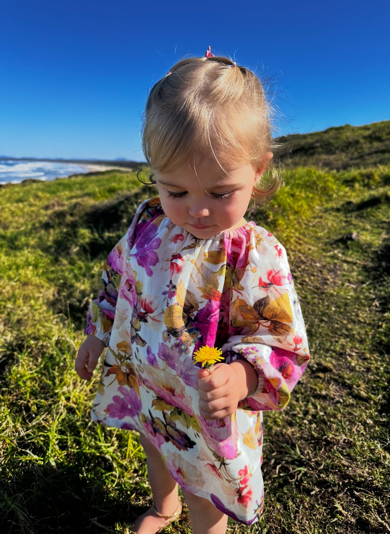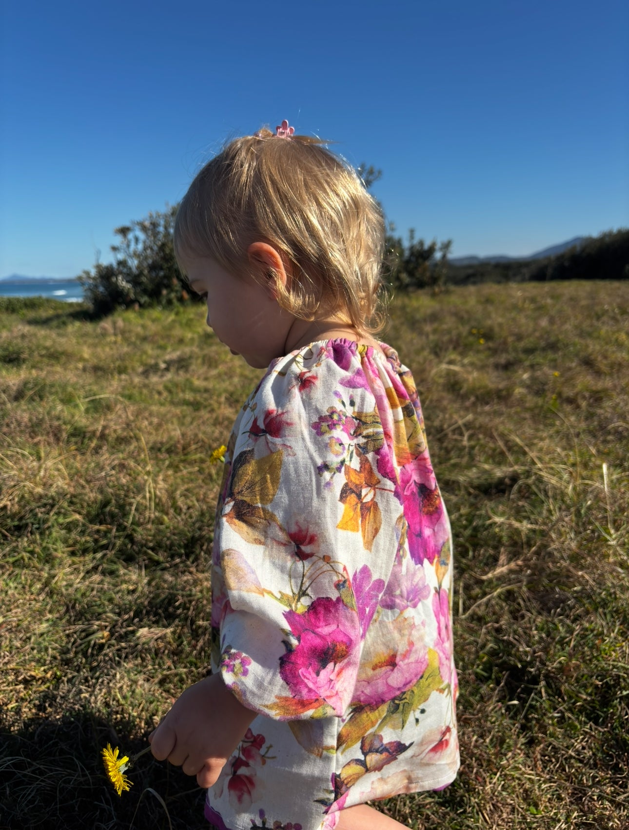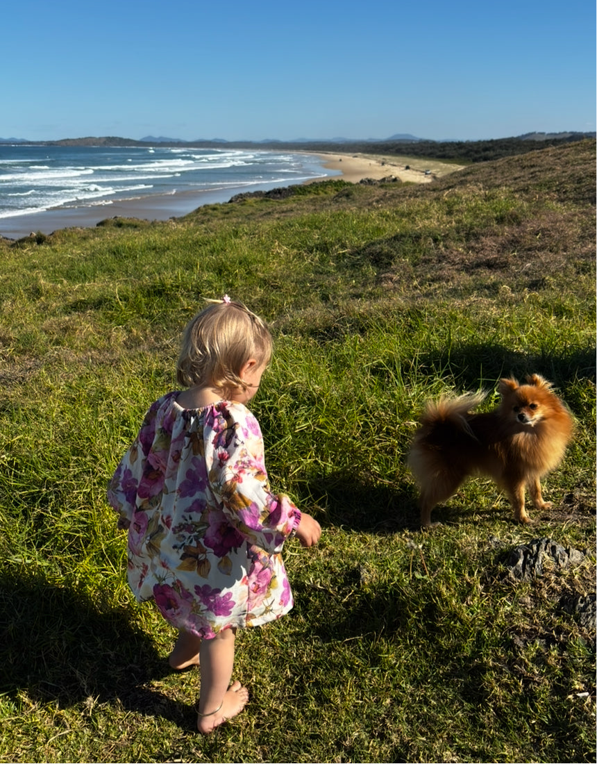 Our Wild blossoms dress is made from the softest cotton blend, the gently gathered neckline and long sleeves add to its sweet, traditional silhouette that allows for effortless movement and all-day wear—perfect for playtime or special outings.