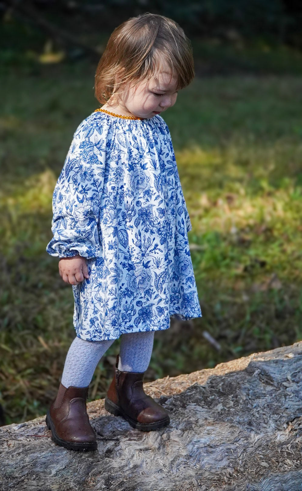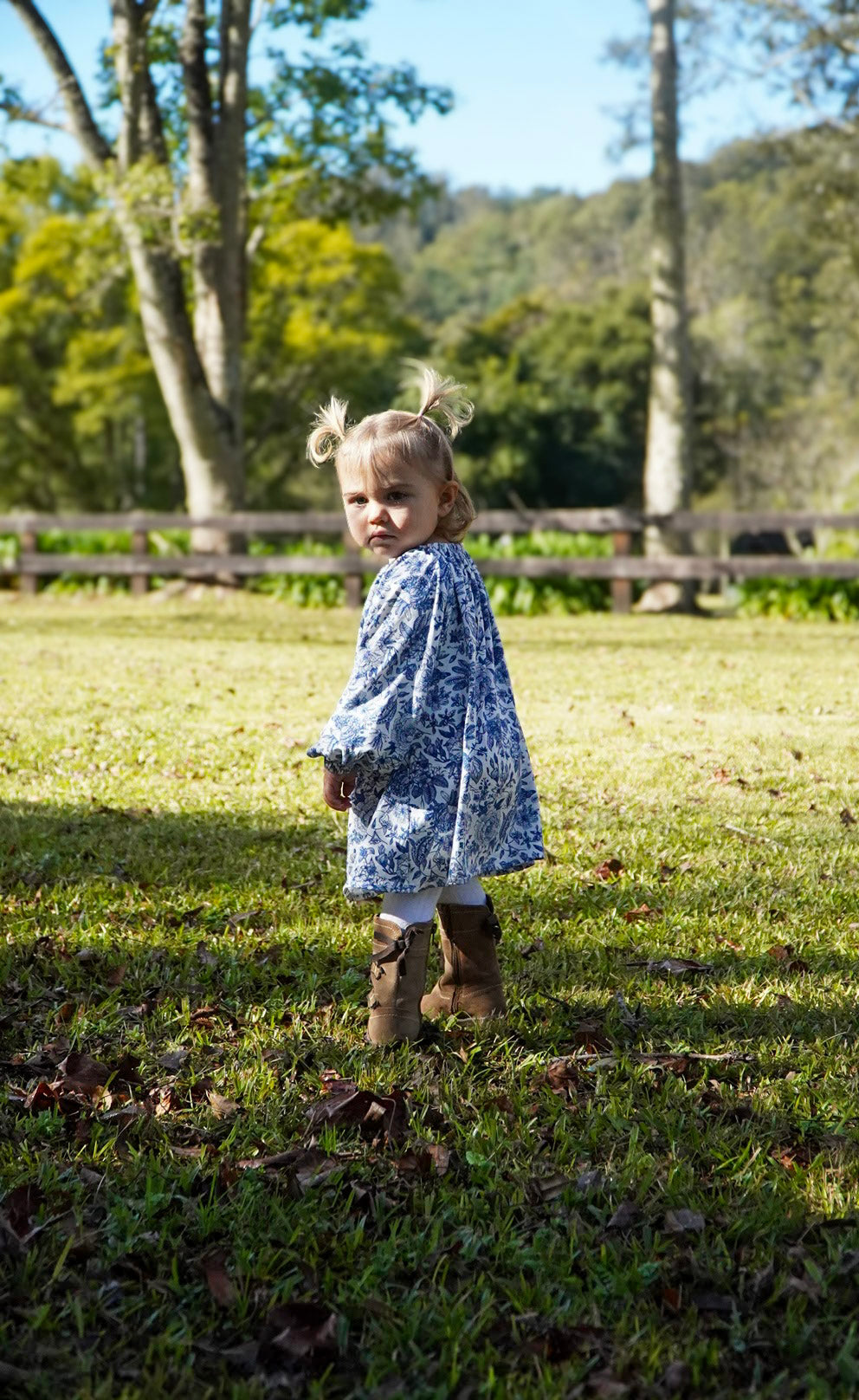 Inspired by timeless heirloom prints, our Willow Dress brings classic charm to modern comfort. This toddler dress features a beautiful blue and white antique willow design, reminiscent of vintage porcelain patterns. Made from soft, stretchy fabric, it allows for effortless movement and all-day wear—perfect for playtime or special outings. The gently gathered neckline and long sleeves add to its sweet, traditional silhouette.